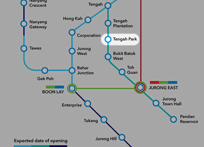 The Tengah Park MRT station will be part of the new Jurong Region Line (JRL). The Jurong Region Line is Singapore’s seventh MRT line, serving both existing and future development in the western part of Singapore. It will significantly improve connectivity of the region and support the development of the Jurong area, which is set to be the largest commercial hub outside the Central Business District.
